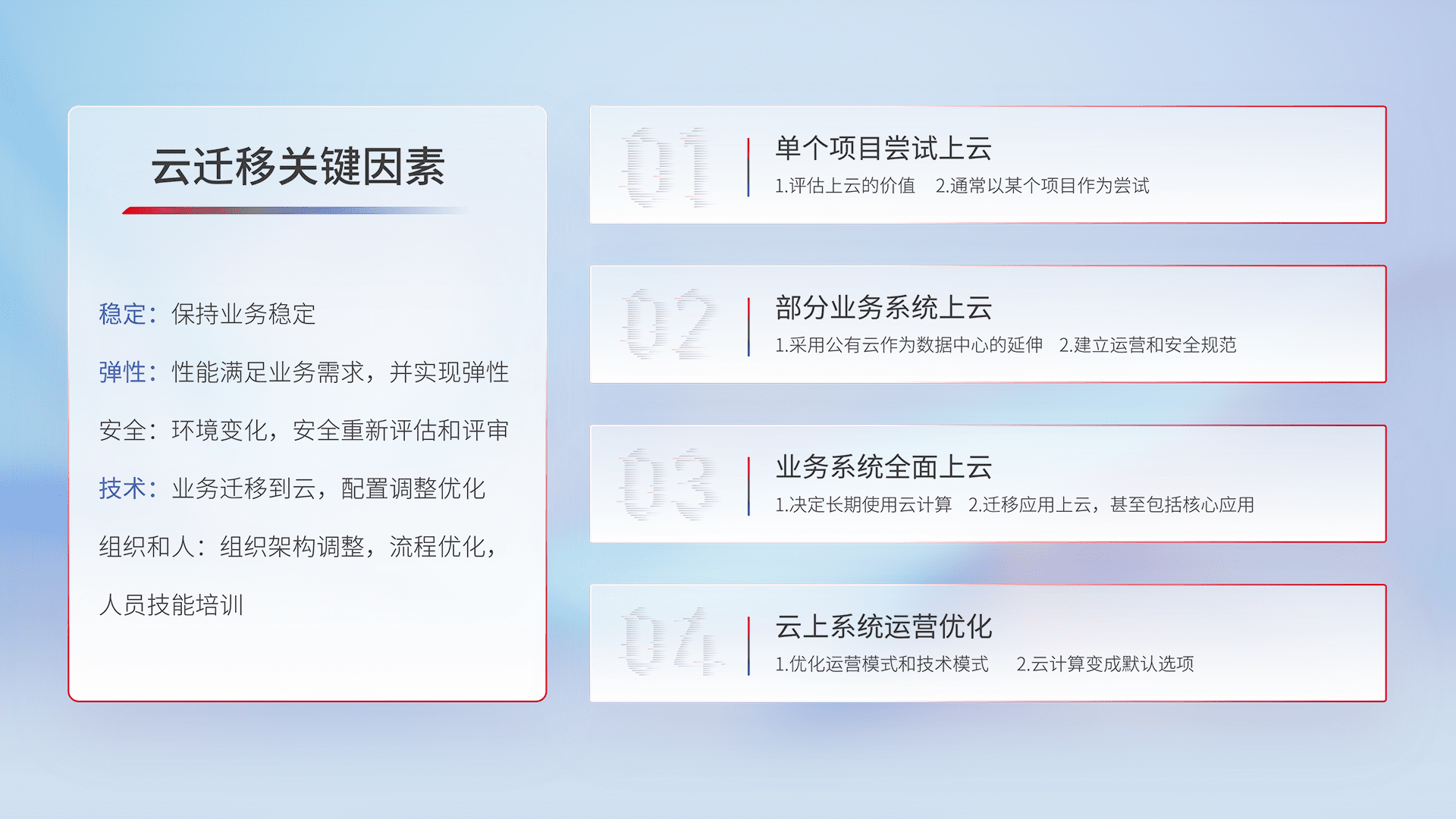 结合实际业务,,从规划设计、、、、云平台选型、、、、云原生改造、、、数据迁移、、、集成交付,,,,迁移全过程为客户识别最佳上云路径,,,做好风险识别管理,,设计网络架构、、身份权限、、安全审计合规、、操作审计、、、日志审计、、监控告警策略、、多站点容灾设计等,,,对云上基础设施进行整体规划,,提升IT治理水平,,,以满足弹性、、、高可用、、、高性能的需求。。