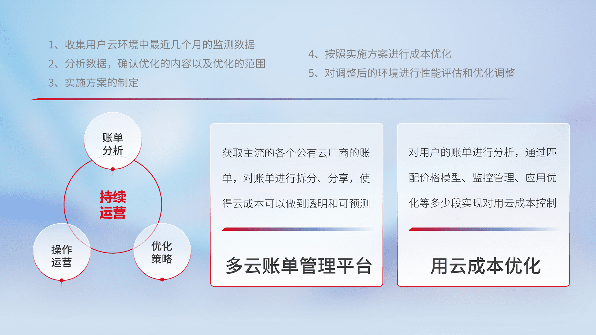 通过多云纳管,,以统一的资源数据模型把客户的云资源进行抽象和封装,,进而实现对多云资源的统一操作,,,保障云资源管理的可靠性、、稳定性与可用性。。。。量身定制化运维内容,,,,配置、、开发运维、、、、补丁管理、、备份、、、、监控、、认证和访问管理、、审计和日常巡检等,,,,保障在用云过程中的可靠度,,,稳定度以及高可用率。。